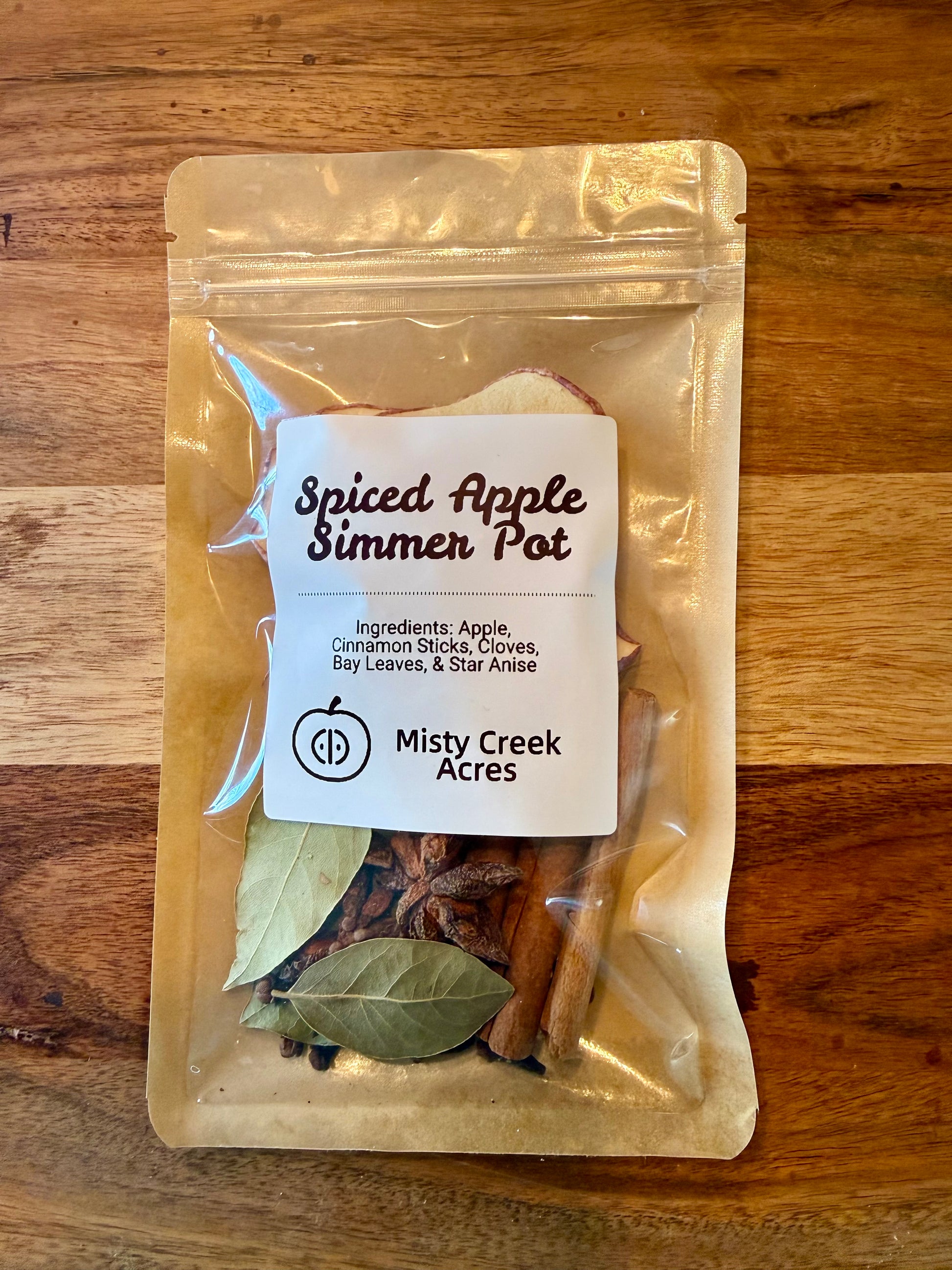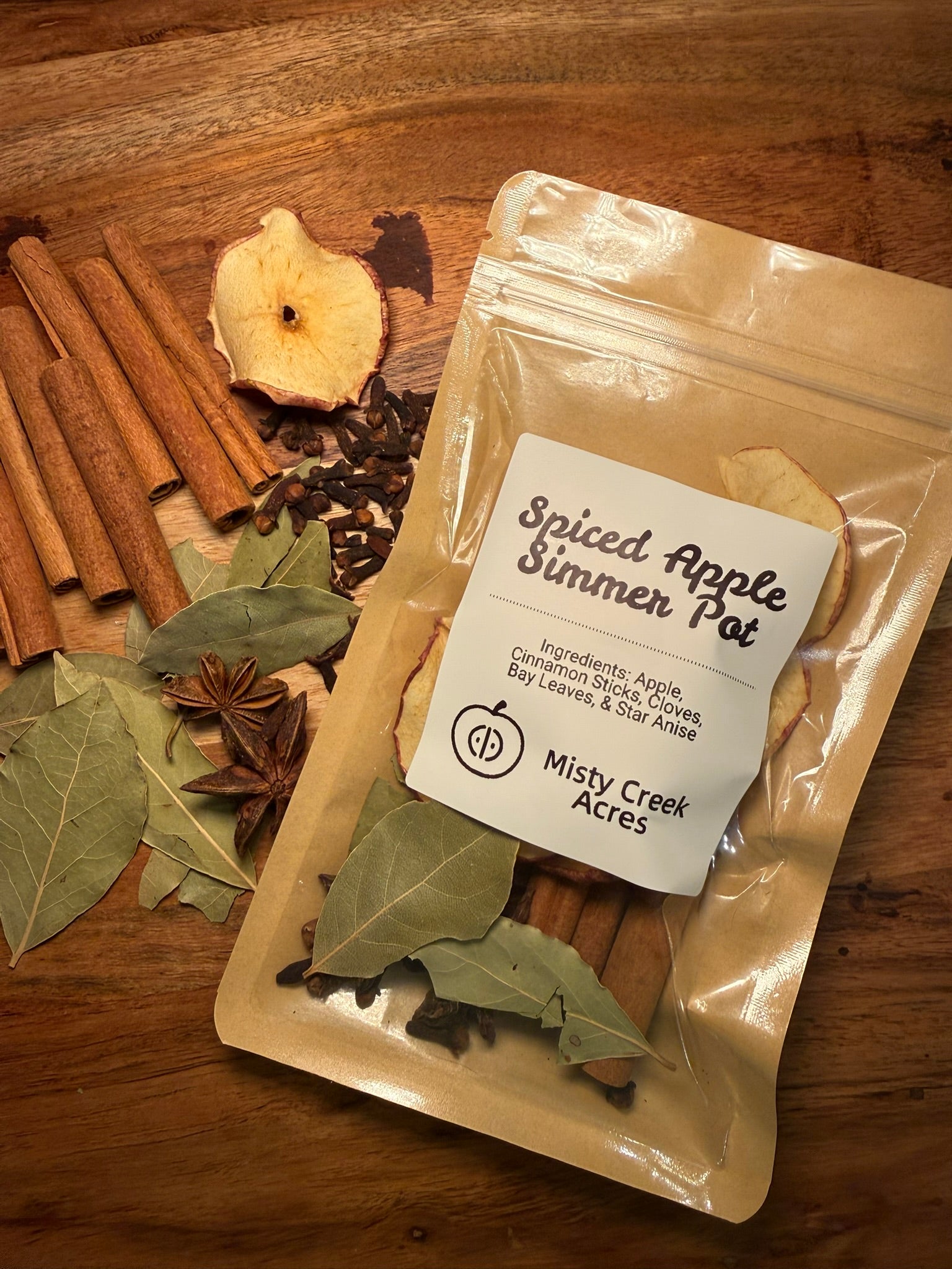 Our Spiced Apple Simmer Pot combines dried apples, cinnamon sticks, cloves, bay leaves, and star anise for a warm, inviting aroma that feels like fall in every breath.